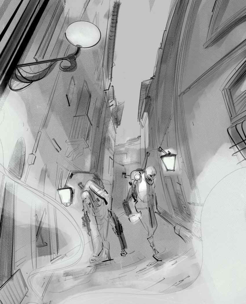 Non ho intenzione di dilungarmi sull’ ambientazione, piuttosto preferisco darvi questa suggestione: immaginatevi a rientrare a casa; è il tramonto e avete lavorato tutto il giorno all’ombra della Torre di Giotto; avete smontato il vostro banchetto e state portando via i vostri attrezzi; è buio e non si vede bene ma in lontananza due lumini fanno capolino ai lati della strada; due fioche lucine illuminano a destra e a sinistra, e poi altre due e cosi via ma non serve la vista per capire cosa sta succedendo; l’aspro odore che invade le vostre narici parla chiaro, due costrutti cadaverici al servizio dell’umanità fanno il loro lavoro: accendono i lumini per le vie di Firenze… e tutto questo è fottutamente NecroPunk!
