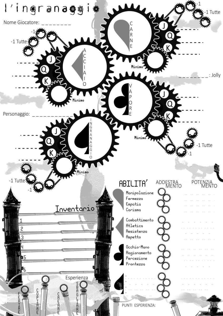 Provo a descriverlo in breve: ogni giocatore possiederà un mazzo formato da una serie di carte da gioco francesci, costruito precedentemente in funzione delle caratteristiche possedute dal suo personaggio. Che vuol dire? Semplice: ogni personaggio possiede 4 caratteristiche principali chiamate Carne, Acciaio, Vapore, Ingranaggio, rispettivamente collegate ai quattro semi delle carte francesi, Cuori, Quadri, Fiori, Picche. Questo elemento è importante poiché il valore assegnato ad ogni seme ci indicherà anche quali carte andremo a prendere da un mazzo di carte francesi. Cosi, se il nostro personaggio avrà dei valori di Carne 4, Acciaio 5, Vapore 8, Ingranaggio 3, prenderemo dal nostro mazzo le carte dall’Asso sino a quel valore, costruendo cosi il NOSTRO mazzo da cui poi pescheremo e giocheremo carte per effettuare azioni (e cosi superare i classici test per fare cose).