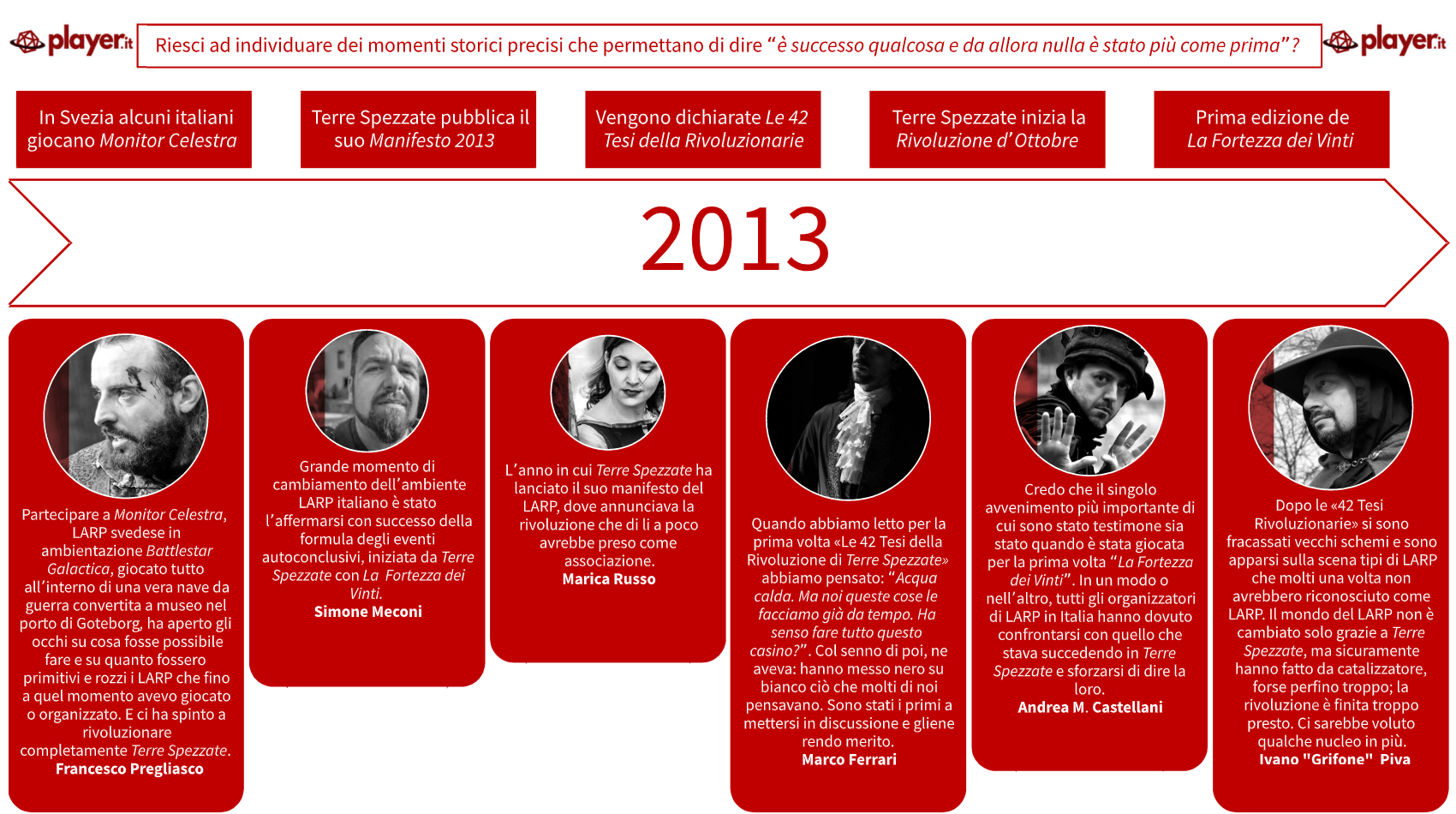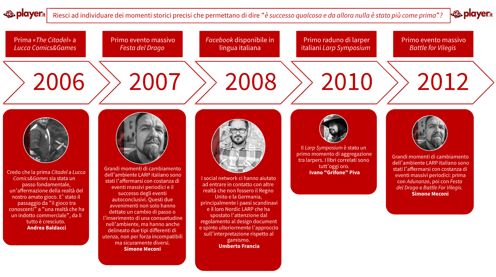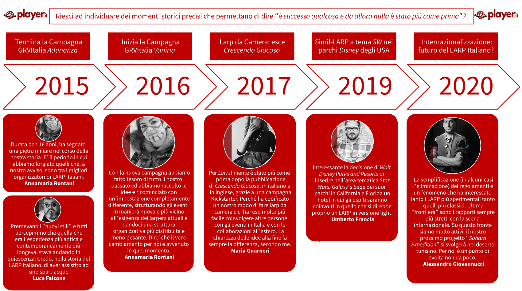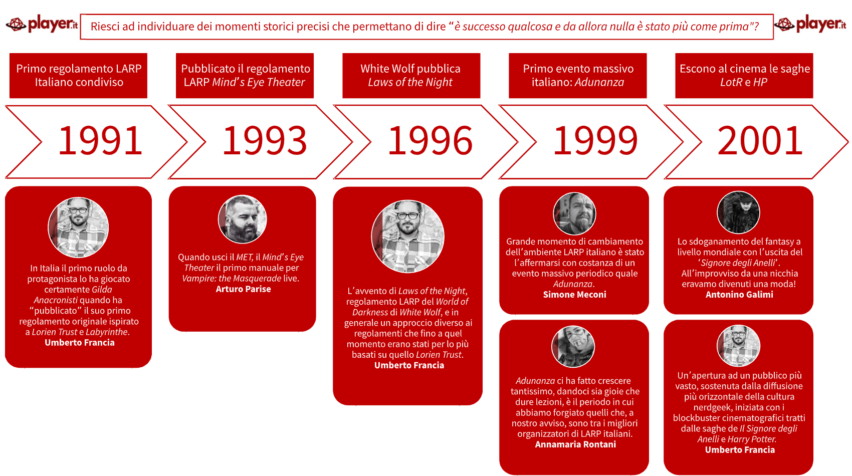 Nota all’infografica – Alcune frasi sono state adattate per renderne più chiaro il messaggio; le risposte complete sono nelle rispettive interviste. Questa non è una cronostoria del LARP Italiano quanto la collocazione temporale dei punti chiave individuati dai miei ospiti a domanda specifica