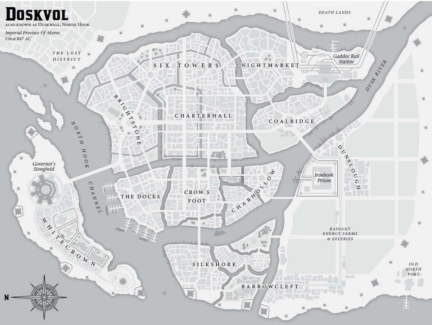 L’ambientazione in cui si muovono i personaggi nasce nel punto in cui le versioni fantasmagoriche e immaginifiche di città come Praga, Venezia e Londra si intersecano e prendono il nome di Doskvol.