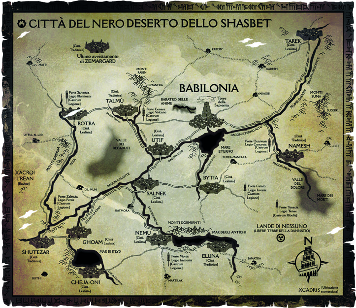 La mitica città riveste sicuramente un ruolo di primo piano in questa ambientazione e il fatto che sia la capitale dell’Impero Nero ne è una prova. Babilonia è un crogiolo di culture, religioni e stirpi, vi si può trovare qualsiasi cosa soprattutto se si sa come orientarsi fra le labirintiche Strade di Nessuno, le vie che collegano i vari quartieri.