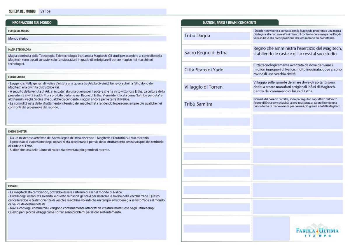 In genere quando si inizia una campagna di un gioco di ruolo, pur condividendo insieme le aspettative e i temi sull’avventura da giocare, è il Master che in autonomia decide come strutturare il mondo e l’ambientazione di gioco. In Fabula Ultima invece si è incoraggiati dal manuale, in particolare dal capitolo “Premi Start“, a creare un mondo insieme attraverso suggerimenti e tabelle di tiro da cui si può trarre spunto.