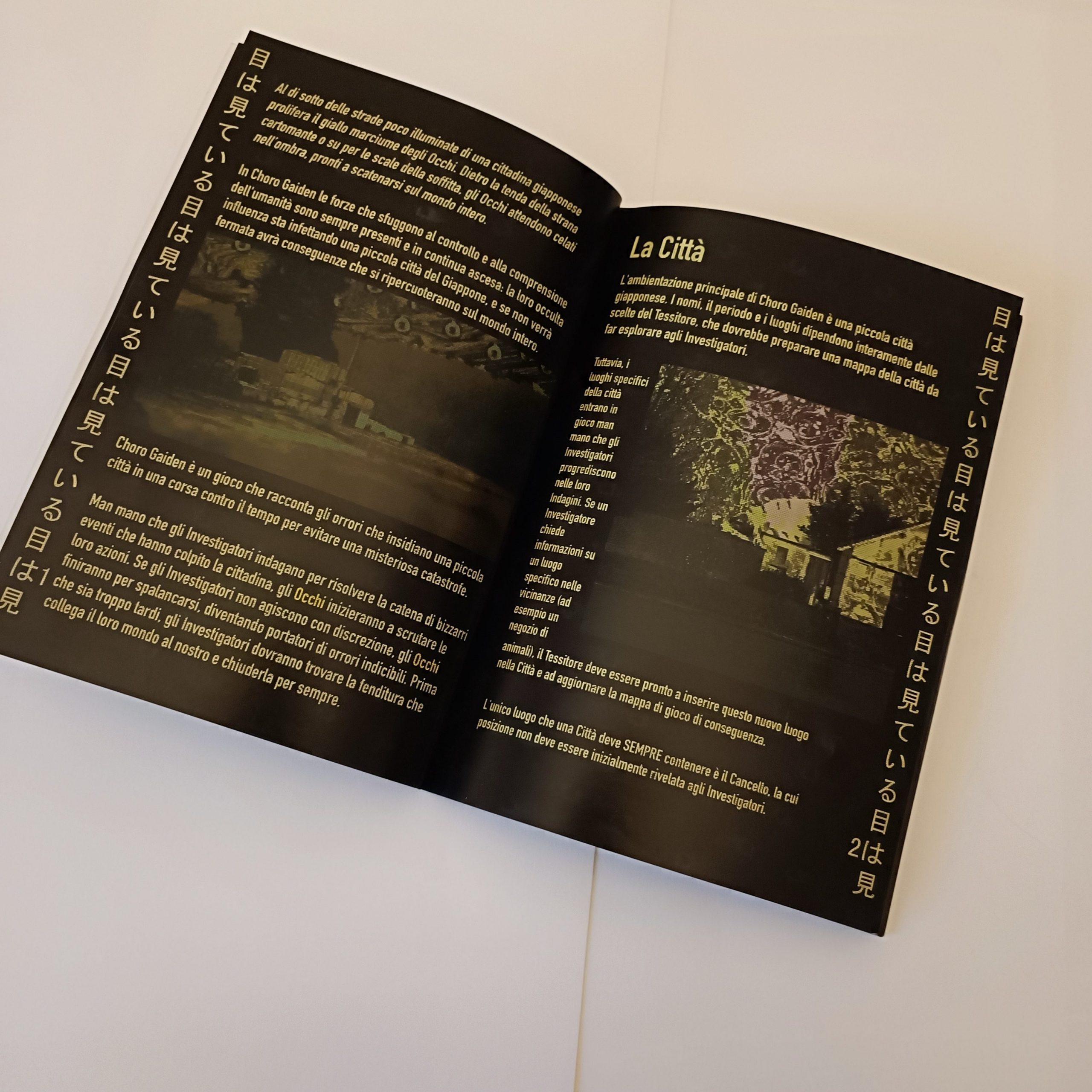Choro Gaiden è infatti un prodotto che ci possiamo provare a definire come “di frontiera” , a metà strada tra un vero e proprio gioco di ruolo e un gioco in scatola narrativo nel quale ogni avventura deve seguire una specie di “schema fisso” in quanto il cammino dei giocatori verso il Cancello si basa sulla chiusura degli “Occhi”, i suoi “avatar” sparsi per tutta la città.