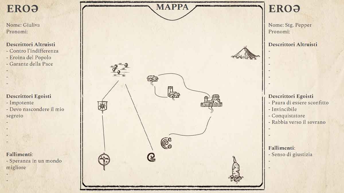 All’inizio, prima di Fasi e Tappe, è ovviamente il momento della creazione del mondo. Lo si crea insieme, ragionando su cosa si voglia più o meno rappresentare nell’avventura. Ogni giocatore poi immagina il suo personaggio e un punto di partenza da segnare su una cartina condivisa che, tappa dopo tappa, andrà via via sempre più aggiornata – non è necessario che la rappresentazione del mondo sia super dettagliata, l’importante è evidenziare il percorso dei propri eroi.