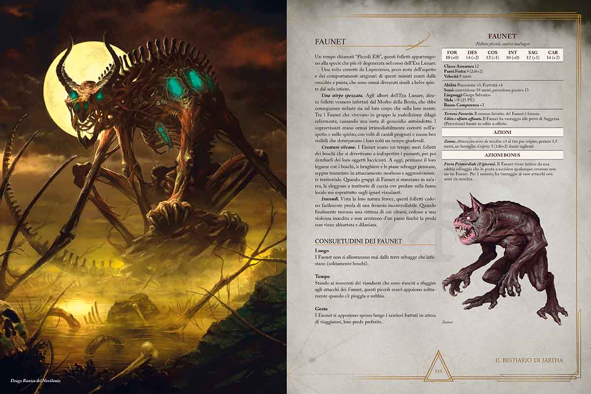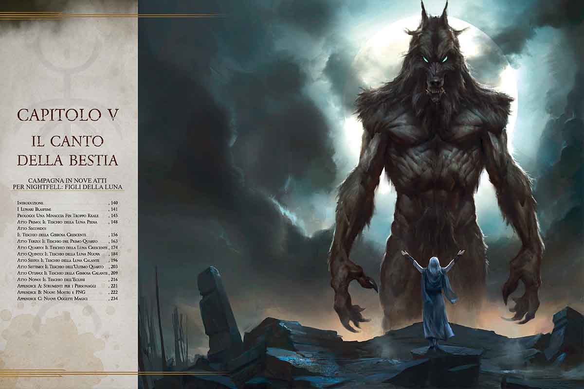 A circa metà libro si arriva poi finalmente alla campagna Il Canto della Bestia, un’avventura dai contorni apocalittici che, a mio avviso, è stata ben congegnata per poterla inserire in un manuale già di per sé ricco nonostante l’esperienza sia in grado di durare mesi: i primi scenari sono affrontabili tra il livello 1 e il livello 4, l’ultimo tra il livello 16 e il 20. La descrizione della campagna, infatti, tratta nel dettaglio solo gli eventi centrali, lasciando al Master la libertà di intervallare i viaggi da un punto all’altro con la sua fantasia, magari sfruttando proprio ispirazioni e tabelle di tiro dei capitoli precedenti di Figli della Luna, costruite proprio ad hoc.