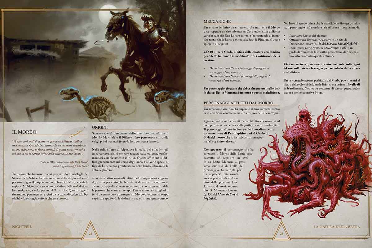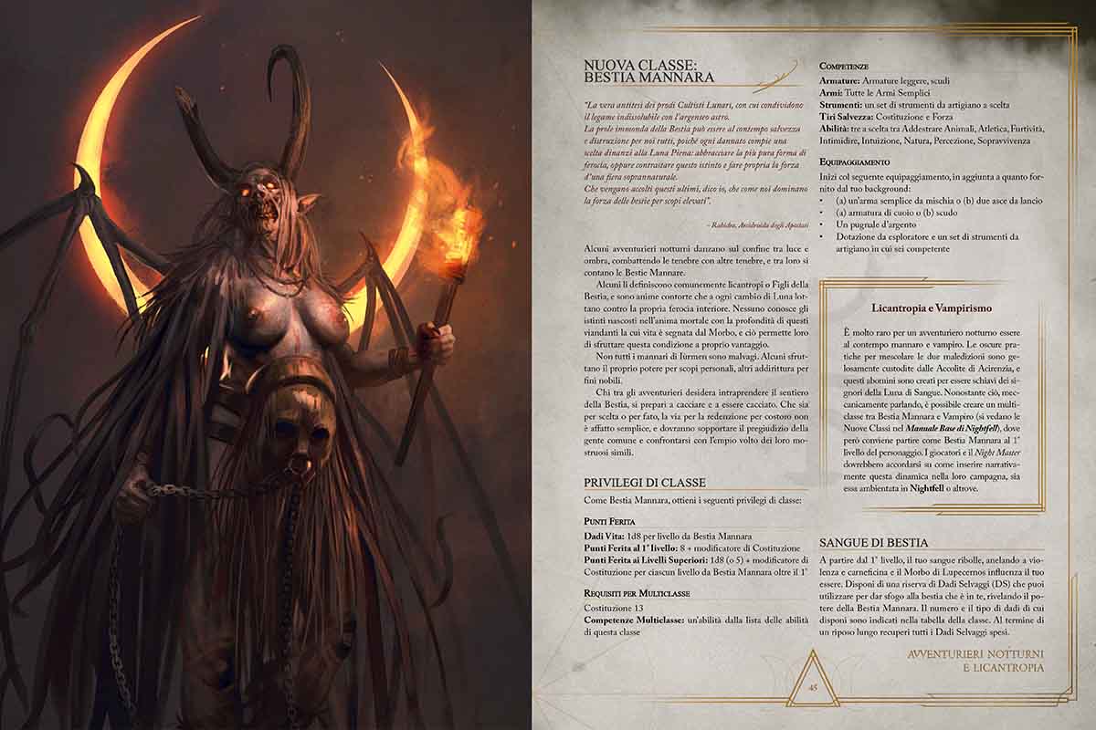 Come il Vampiro nel manuale base di Nightfell, anche la Bestia Mannara è una Classe che il giocatore può scegliere per il suo personaggio, e non una razza o un semplice compendio di meccaniche da aggiungere tra i talenti. In realtà gli autori di Nightfell avevano già incluso nell’ambientazione la loro fantasiosa forma di licantropia nella Razza degli Alperni, umanoidi col sangue maledetto che in determinate fasi lunari li trasforma in bestie ibride.