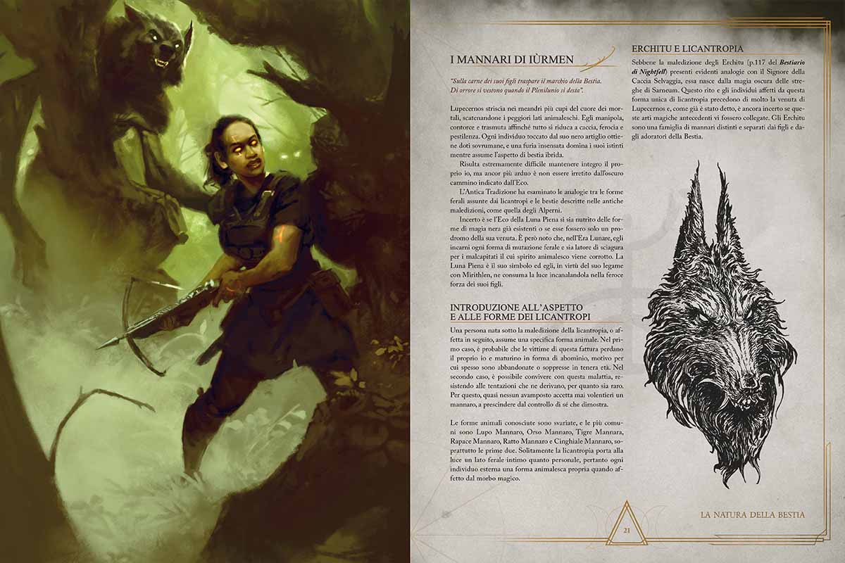 Il libro si apre con una possente infarinatura di lore, per la maggior parte incentrata proprio sulle declinazioni della licantropia nel mondo di Iùrmen e sulle sue influenze. Sembrava strano, in effetti, che nei manuali precedenti di Nightfell vi fossero poche menzioni a questa particolare maledizione legata alla Luna quando proprio l’ambientazione fa della Luna il suo fulcro centrale.