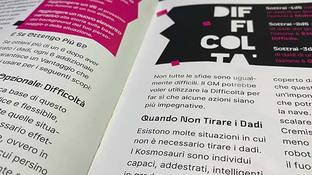 Kosmosaurs diventa quindi molto efficace per partite e sessioni brevi, occasioni in cui le situazioni che si vengono a creare non possono che divertire le persone al tavolo, coadiuvate da tabelle di tiro per eventi e nemici anch’esse un po’ sopra le righe. Basti pensare che tra gli acerrimi nemici menzionati dal manuale, con tanto di pagine e illustrazioni dedicate, ci sono pirati non-morti, melme dedite alla burocrazia, sauri opposti ai Kosmosauri che provengono dalla dimensione del Vuoto, e, soprattutto, i Broccoloidi, i n*zisti delle verdure spaziali.