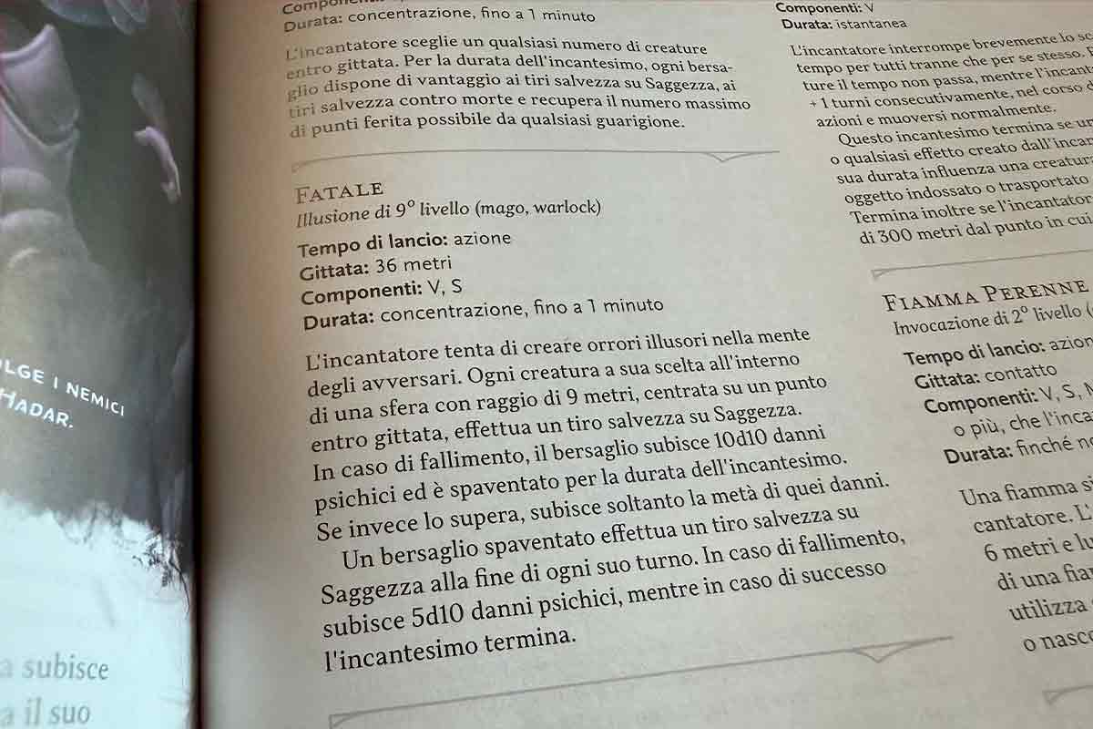 Le seconde invece vedono traduzioni come “Evocare” al posto di “Richiamare”, “Evocatore” al posto di “Invocatore” (causando una confusione immonda tra le sottoclassi del mago, già confusionaria per loro natura visti i nomi delle scuole di magia) fino a scelte più discutibili e che nella lingua italiana rendono ben poco l’idea, come la padronanza Doppio Fendente per indicare la padronanza “Cleave” o addirittura un incantesimo di illusione di livello alto tradotto da Weird (Strambo, Ambiguo) a Fatale.