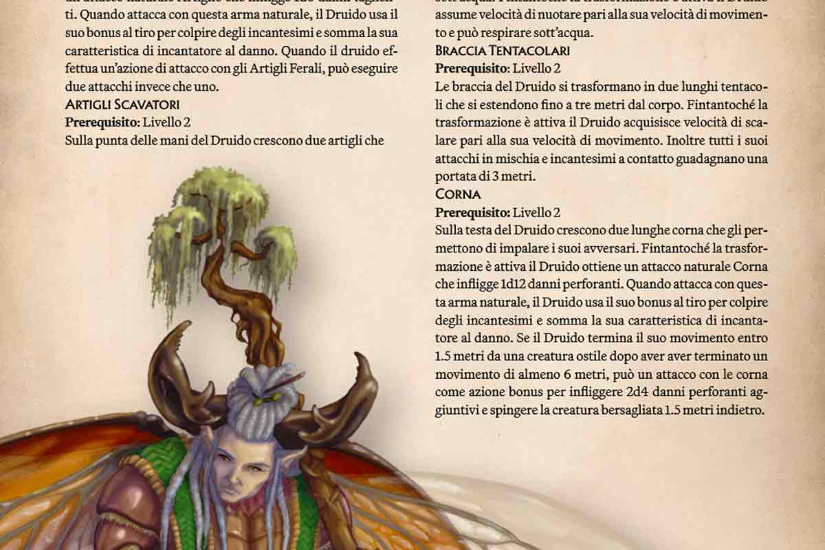 La parte meccanica del quickstart è poi chiusa con due sottoclassi: Il Druido Chimerico, capace di trasformare parti del suo corpo diventando una chimera, e il Guerriero Corsaro, un combattente che fa della paura e dell’intimidazione un’arma da battaglia.