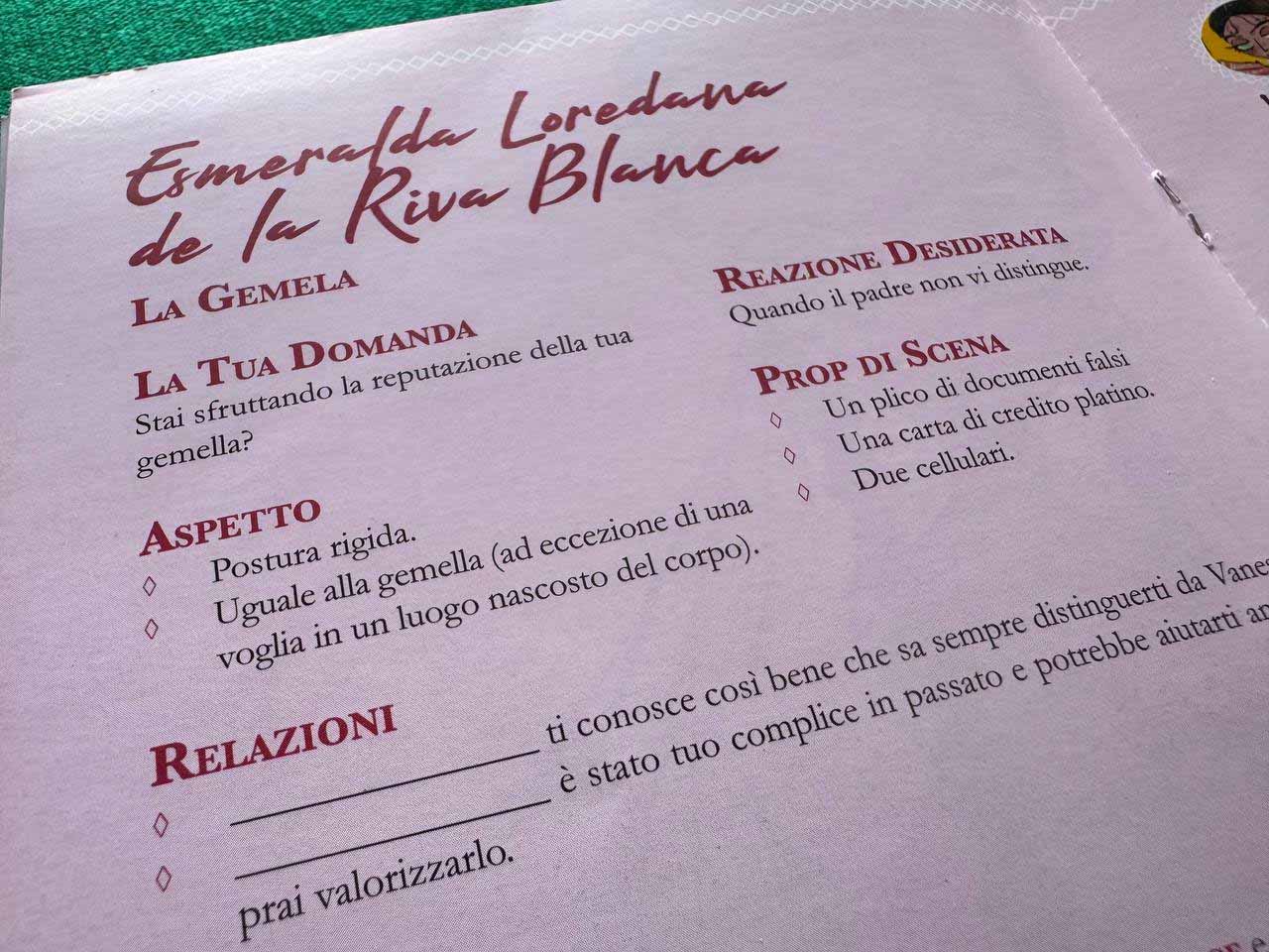 Gli oggetti di scena, o prop, sono elementi tipici del personaggio interpretato che, sebbene possano essere sempre sventolati in giro come flavor, possono essere usati in termini meccanici aggiungendo un +1 ai tiri delle mosse. Nella sessione di prova al Gamever, per esempio, ci siamo inventati la soap opera El Juego Eterno (parodia di Gamever, appunto), un resort e casinò che avrebbe avuto di lì a poco una festa in maschera. Come prop di scena ho chiesto ai giocatori di prepararmi sia un oggetto relativo al proprio costume della serata in maschera, sia un oggetto iconico del personaggio.