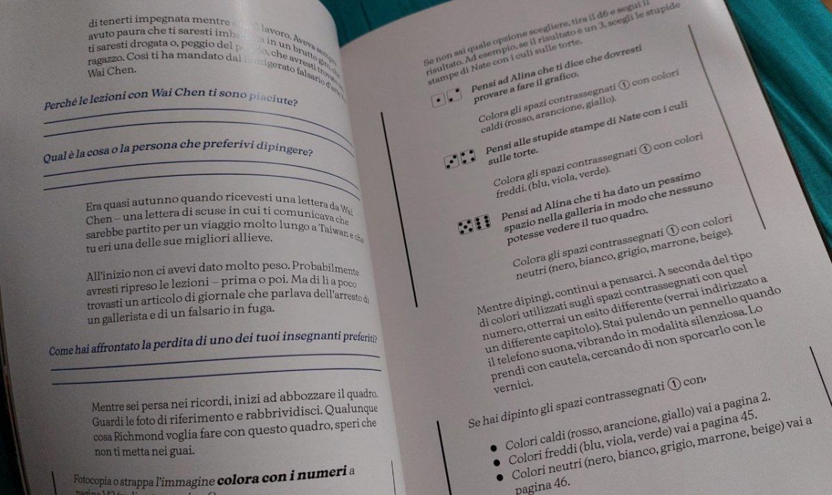 Nei momenti chiave della trama però la nostra protagonista sarà sempre a casa davanti al quadro, in attesa della nostra scelta di colori: il disegno fornito sia nel manuale stesso che scaricabile online dal sito di Narrattiva segue lo stile Paint By Numbers, dunque è diviso in aree contrassegnate da numeri. Il libro ci chiederà di dipingere le aree dal numero uguale con colori caldi, freddi o neutri e saranno proprio le tonalità che sceglieremo a rimandarci ai diversi capitoli e alterare la storia.