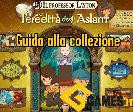 Eccoci di nuovo a vestire i panni dell’enigmatico professore con la lunga tuba nel nuovo “Il Professor Layton e l’eredità degli Aslant” per svelare il mistero che si cela dietro l’antica civiltà degli Aslant. Come in tutti i capitoli del professore, anche qui dovremo raccogliere dei simpatici oggetti nascosti negli scenari di gioco, 40 in totale. La nostra guida vi mostrerà dove e quando trovarli per completare la collezione del professore!