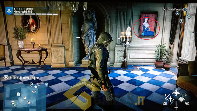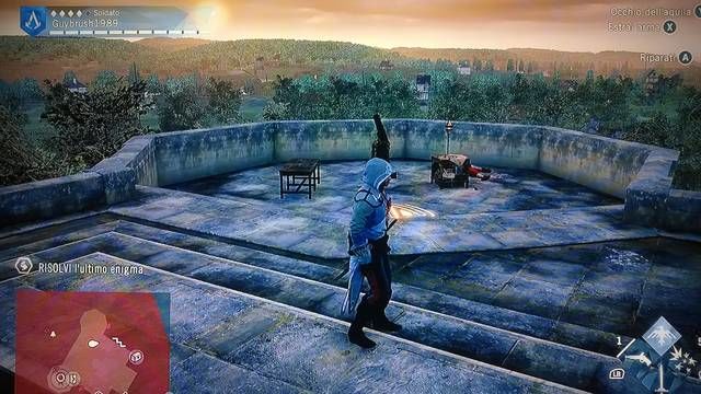 Sulla torretta in mezzo al labirinto di siepi che potrete vedere dal luogo del precedente enigma. Non c’è bisogno di scassinare la porta di difficoltà 3 per raggiungere la torretta, fate il giro e troverete una siepe sotto cui scivolare.