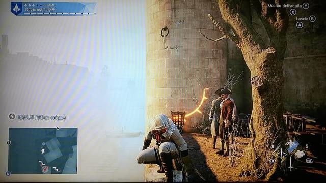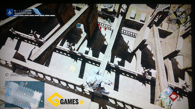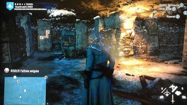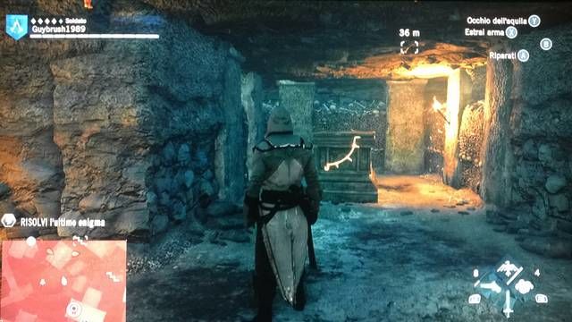 Il simbolo si trova nel punto dell’indicatore blu, del personaggio, sulla mappa sottostante. Per accedervi però dovete entrare nel passaggio più in alto, indicato dal mirino bianco. Scendete nel sottosuolo e proseguite fino a saltare le fosse. Girate a sinistra non appena trovate i due bracieri e passate infine sotto le assi per arrivare nel punto esatto.