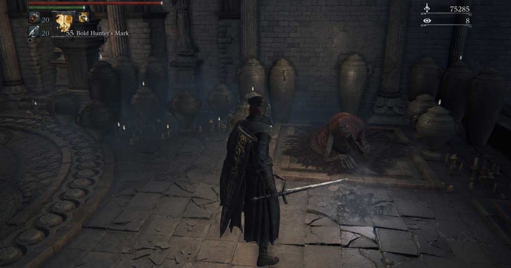- Non entrate in OLD YHARNAM ma comprate l’emblema del CAPO CACCIATORE e proseguite verso la GRANDE CATTEDRALE. Se entrate a OLD YHARNAM e DJURA vi spara anche solo una volta rimarrà ostile per tutto il gioco.