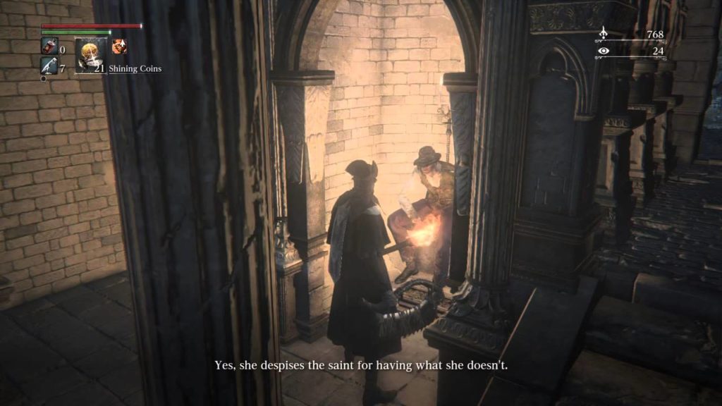 La piccola vi dirà che i suoi genitori sono usciti per la Caccia e che non sono mai più tornati. Vi informerà che sua madre ha una SPILLA ROSSA mentre suo padre è un Cacciatore e a volte perde la ragione. Proprio per questo motivo vi regalerà un CARILLON con il quale far tornare la ragione al caro paparino. I più attenti avranno già capito che il papà della bambina altri non è che PADRE GASCOIGNE, uno dei boss/preda del gioco. Il Carillon sarà infatti uno strumento utilissimo per eliminarlo, GUARDATE QUA PER CREDERE.