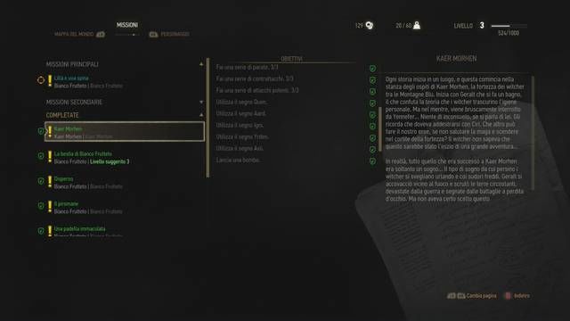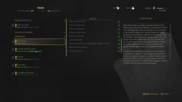 INFORMAZIONI: Semplice Tutorial iniziale del gioco, dopo la discussione in camera, scendete in cortile seguendo gli aiuti forniti dal gioco. Dopo il dialogo potrete scegliere se correre o meno con Ciri sulle mura del castello (saltando questa fase salterete il tutorial sui movimenti). Raggiunta la fase successiva terminate il tutorial di combattimento seguendo le istruzioni a schermo e rinfoderate la spada per terminare e iniziare a giocare. Se non rinfoderate la spada potete continuare ad allenarvi quanto volete.