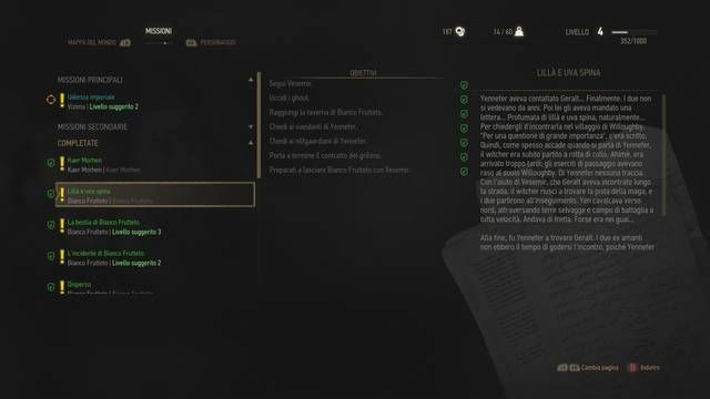 INFORMAZIONI: Una volta svegli, seguite VESEMIR a cavallo ed eliminate i fastidiosi GHOUL. Proseguite sempre seguendo VESEMIR, se volete potete fermarvi nel villaggio distrutto a raccogliere qualche consumabile da barili, casse ecc. Aiutate il povero mercante attaccato dal GRIFONE e non chiedete lacuna ricompensa per ricevere informazioni utili dall’uomo. Una volta alla LOCANDA dite all’oste che avete aiutato l’uomo per ricevere un trattamento di favore. Dopo il dialogo cercate informazioni su YENNEFER usando il segno di MANIPOLAZIONE MENTALE sui due bifolchi vicino al vostro tavolo. Vi diranno di chiedere ai SOLDATI NILFGAARD. Raggiungete la roccaforte nell’accampamento dei soldati e parlate con il COMANDANTE che vi chiederà di eliminare il GRIFONE che infesta la zona in cambio dell’informazione. Seguite la guida alle MISSIONI SECONDARIE – LA BESTIA DI BIANCO FRUTTETO. Eliminato il Grifone tornate dal comandante per sapere di Yennefer (potete decidere se accettare o meno la ricompensa del viscido uomo). Ora dovrete semplicemente tornare da VESEMIR alla locanda e partire per terminare la missione. Questo è un buon momento per portare a termine qualche MISSIONE SECONDARIA a BIANCO FRUTTETO prima di procedere.