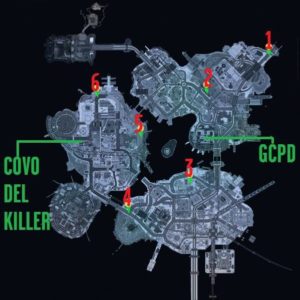 Nella mappa seguente trovate tutti i punti in cui il killer ha esposto i corpi mutilati delle vittime. Tutto quello che dovrete fare è recarvi in una di queste zone e potrete esaminare il cadavere: