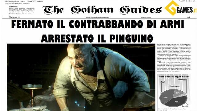 Proseguendo nella trama principale, a circa il 50% di completamento della Missione Storia CITTA’ DELLA PAURA, verrete informati da Alfred che Nightwing, alias Dick Grayson, sta indagando su alcuni traffici di armi sospetti e che forse potrebbe essere coinvolto anche Oswald Cobbelpot, il Pinguino. Una volta completata la prima parte della missione, dovrete sempre proseguire nella trama principale per sbloccare le altre a intervalli regolari. Controllate la ruota delle missioni per scoprire quando compariranno nuove INFO sul simbolo del CONTRABBANDO DI ARMI. Le missioni sono divise sostanzialmente in 3 fasi: