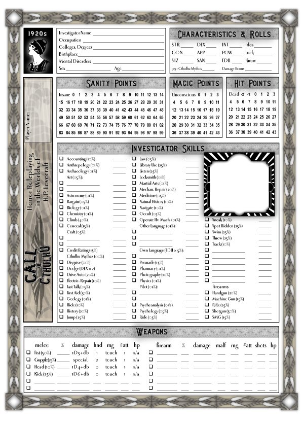 Sulla scheda del personaggio poi è riportato un fitto elenco di abilità: dalle classiche Nascondersi, Raggirare, Individuare, Ascoltare ecc… a innumerevoli altre abilità di conoscenza: si va da Archeologia ad Occulto, da Antropologia a Storia o Geologia, non mancano Lingue, Psicologia e Psicoanalisi e così via.