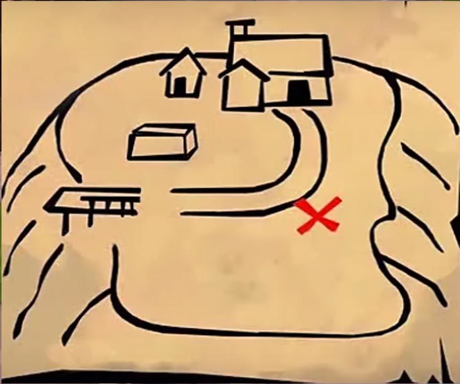 Questa mappa del tesoro si trova in quel di Laboratorio Della Latrina, attaccata ad un muro interno della località. Essa mostra come la cima di una collina solitaria con un piccolo complesso agricolo composto da due casupole e un’ abitazione più tradizionale. La stella della battaglia si trova nelle vicinanze di questa strada