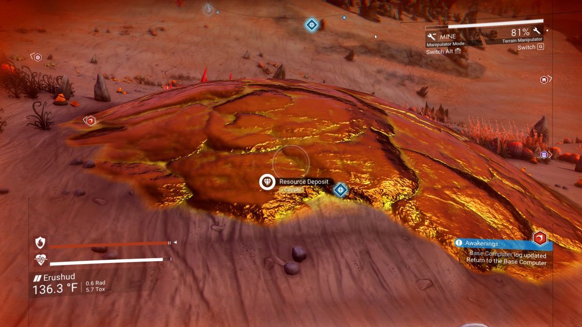 Una volta che hai i progetti, fai l’aggiornamento per il tuo Multi-Tool, così poi potrai switchare tra i tipi di arma in possesso in qualsiasi momento. Il manipolatore ti permette di manipolare il terreno e raccogliere il rame. Una volta fatto, apri il Visore e cerca i giacimenti di rame, che dovrebbero essere contrassegnati. Recati verso uno di essi e poi estrai il metallo.