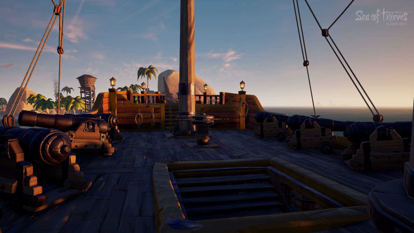 Innanzitutto bisogna dire che al momento in Sea of Thieves esistono due tipi di nave, una di piccole dimensioni, adatta a un equipaggio di una o due persone, e poi c’è il galeone, governato da una ciurma formata da tre o quattro bucanieri. Quando entreremo in gioco ci verrà fornita la nave della grandezza adatta alla nostra crew di pirati.