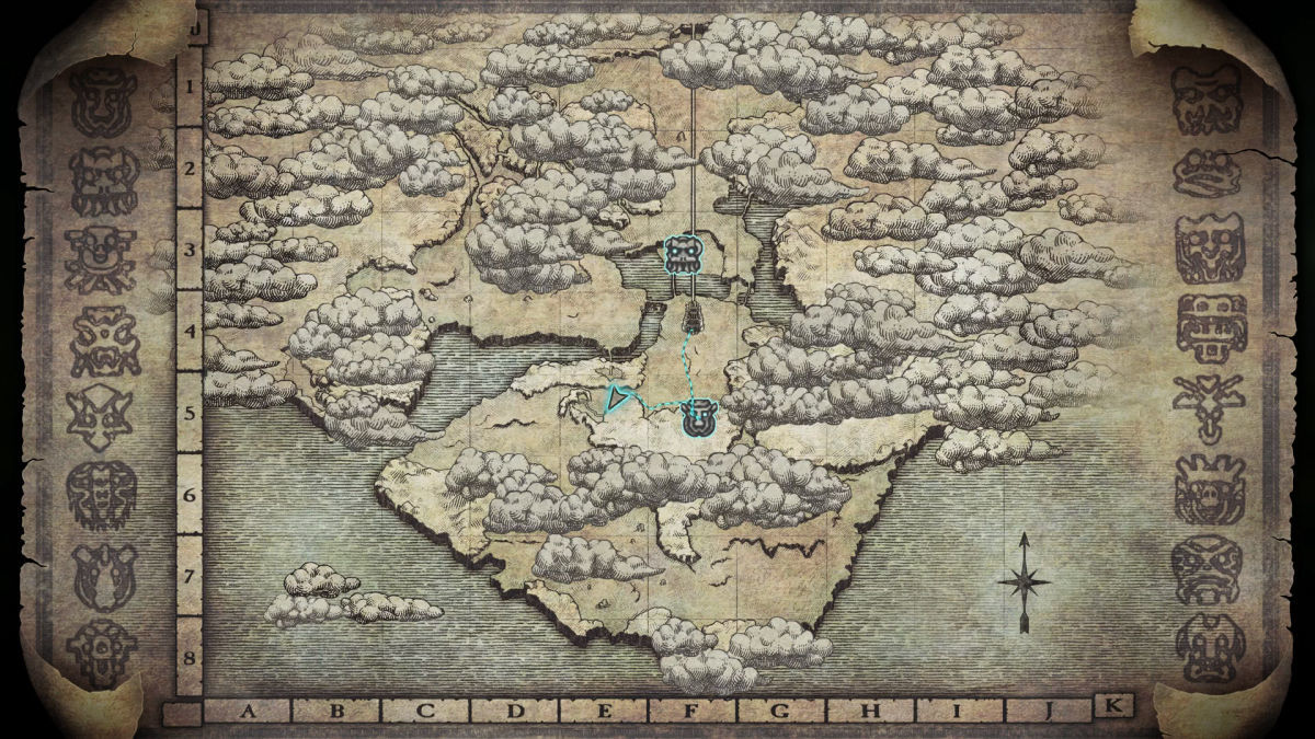 Se si sta viaggiando dal santuario principale, è necessario individuare sulla mappa l’area E5, un po’ come se stessimo giocando a battaglia navale. Sulla mappa qui in basso potete vedere il punto preciso. Dirigiamoci verso quest’area e quindi seguiamo il percorso fino a raggiungere un bivio. Scegliamo di girare a destra e dovremmo trovarci di fronte a una grotta che conduce verso il basso. Consigliamo di fare questa parte dei boschi senza l’ausilio del cavallo. A piedi difficilmente mancheremo la caverna.