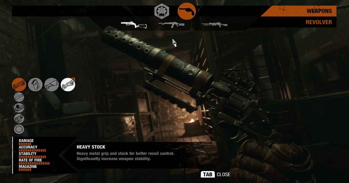 Ad ogni modo, una volta arrivato a un banco di lavoro, avvicinati, attiva il menu di modifica e seleziona l’icona in alto della pistola. La pulizia della pistola sarà la prima opzione. Il gioco ti offre un indicatore di pulizia a sinistra. Più completo è, più pulita è la pistola. Puoi anche passare tra le pistole in uso.