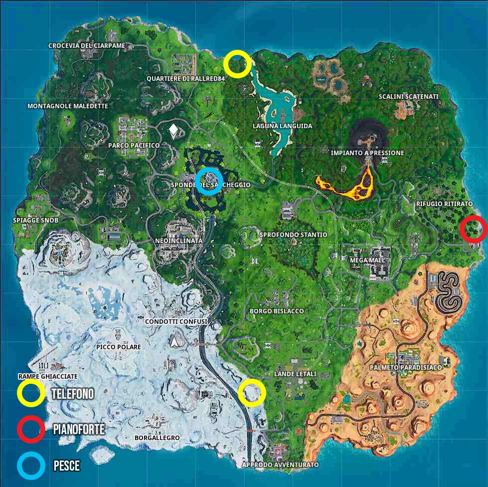 Questi tre grandi oggetti si trovano tutti quanti sparsi per una precisa zona della mappa di Fortnite Battaglia Reale, ora vediamo insieme dove si trovano questi tre luoghi, dove è il punto da raggiungere per ottenere la stella della battaglia e come si può completare questa sfida in tempo record.