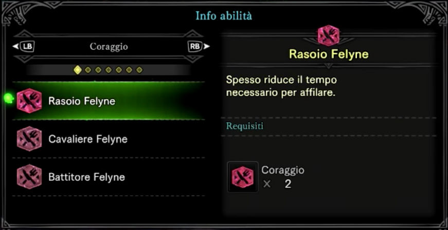 6 Pezzi arancio: Eroismo Felyne: Incrementa l’attacco quando la salute è bassa.