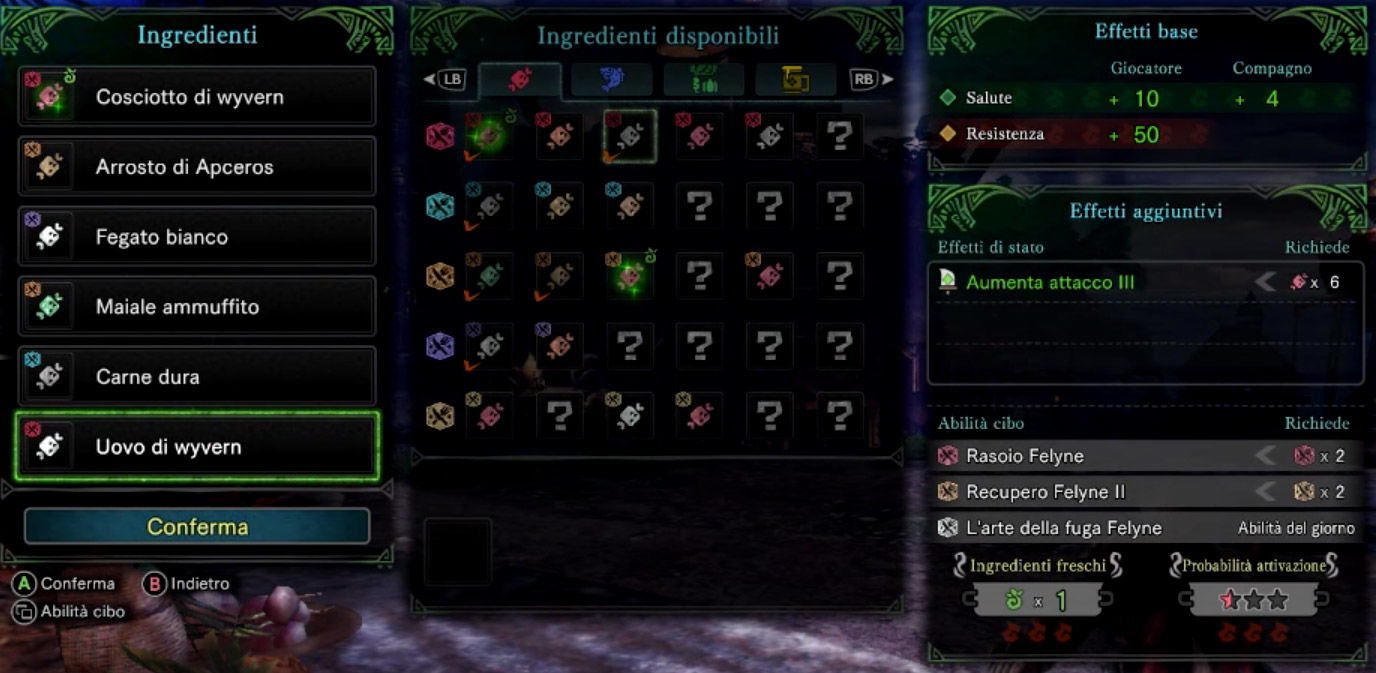 Mangiare 2, 4 o 6 ingredienti da queste categorie, non necessariamente tutte carne o tutte pesce, avrà la possibilità di fornirvi delle particolari abilità dette Abilità Felyne.