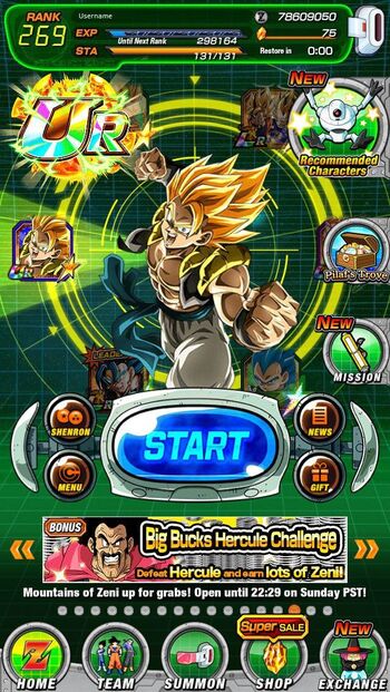 Subito sotto il nostro team, appare il tasto centrale START, che darà il via alla nostra quest principale e i 4 tasti laterali: news, gift (nel caso gli sviluppatori volessero omaggiarvi con personaggi e oggetti extra), menù (che vi darà accesso alle varie opzioni di gioco) e Shenron, un tasto che nel caso abbiate raccolto tutte le sette sfere durante l’avventura, vi permetterà di evocare il drago ed esprimere un desiderio (inutile chiedere i numeri vincenti del Lotto, ci abbiamo già provato noi).