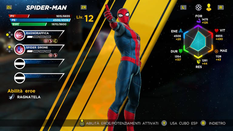 Ogni supereroe del gioco presenta diversi parametri con statistiche peculiari che lo caratterizzano e lo differenziano.