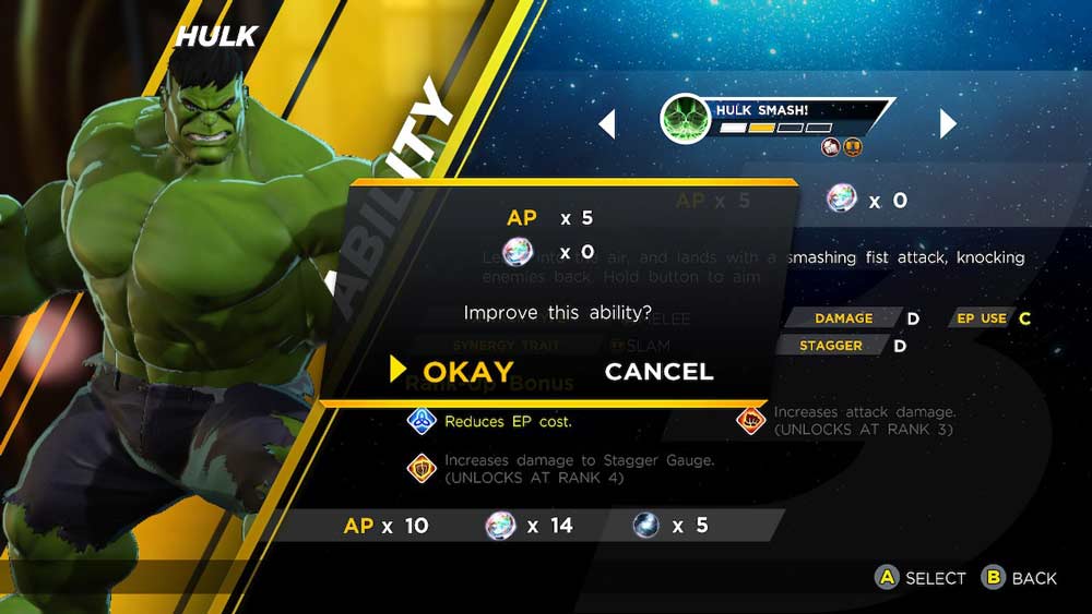 Durante tutte le tue partite in Marvel Ultimate Alliance 3, sarai in grado di aggiornare le abilità dei tuoi eroi preferiti per affrontare anche i più cattivi e potenti nemici intergalattici.