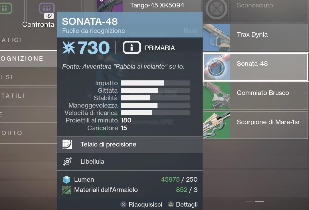 Completando l’Avventura “Rabbia al volante” su Io sbloccherete Sonata-48, un Fucile da Ricognizione Raro. Smontatelo, poi andate nelle Collezioni e riacquisitelo al prezzo di 250 Lumen e 3 Materiali dell’Armaiolo, dopodiché smontatelo di nuovo e ripetete il ciclo. Smontarlo vi restituirà 125 Lumen e 2 Materiali dell’Armaiolo, quindi potrete comodamente completare questo step possedendo 500 Lumen e 4 Materiali dell’Armaiolo.