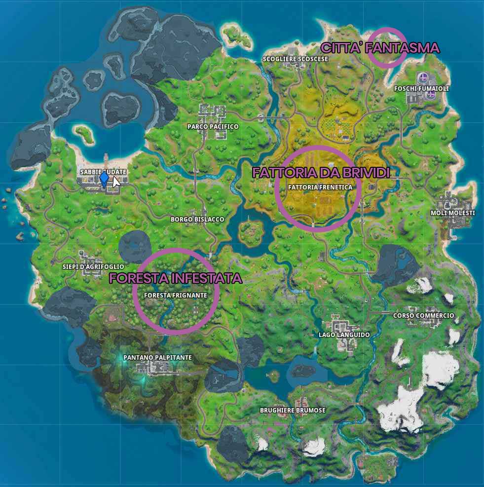 Questa sfida chiede al giocatore di andare a cercare delle casse all’interno di tre particolari location: una foresta infestata, una città infestata e una fattoria infestata. La prima, la foresta infestata, è praticamente Foresta Frignante, location con il minor numero di casse del gioco; la città fantasma è rappresentata dal manipolo di case che possiamo trovare più più a nord-ovest di Foschi Fumaioli, nella location storica chiamata Punto Pristino. La fattoria da brividi è invece, ovviamente, Fattoria Frenetica, Location quasi centrale nella mappa di gioco e abbastanza famosa di suo; da queste parti non sarà sicuramente un problema recuperare una cassa e andare a completare la sfida di questo evento.