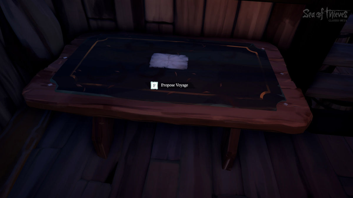 Una volta acquistato il viaggio che siete interessati ad intraprendere con l’equipaggio, tornate alla vostra nave e cercate il tavolo Propose Voyage (Proponi Viaggio). Interagendo con questo tavolo (che potete vedere nella foto sottostante) si dà praticamente la possibilità ai membri di votarlo. Se soddisfa tutti, si può dare inizio alla quest. Infatti, l’articolo 4 del Codice dei Pirati in Sea of Thieves recita così: