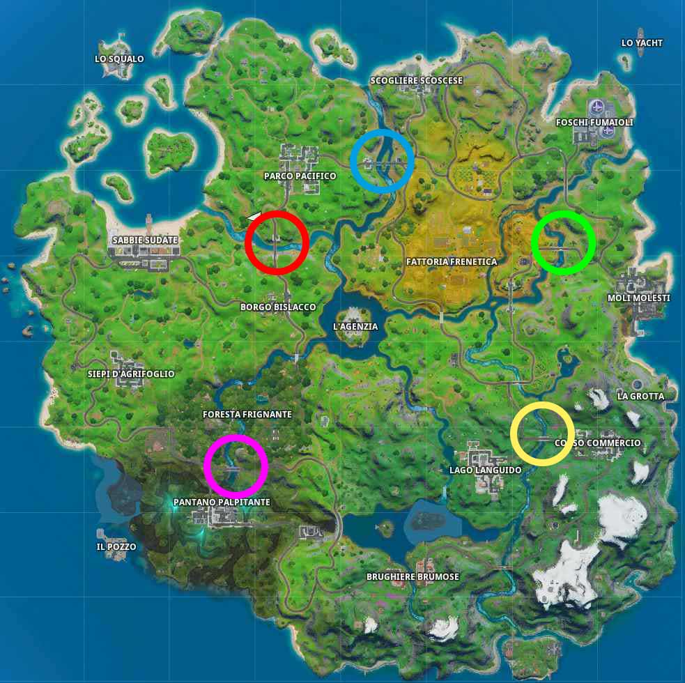 Rispetto alla precedente stagione di gioco la posizione dei ponti colorati all’interno di Fortnite non è cambiata, motivo per cui seguendo la mappa che vi abbiamo mostrato sopra sarà relativamente facile completare la sfida.