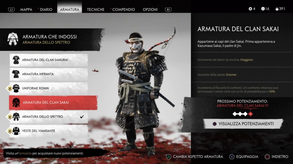 Potenziare le armature in Ghost of Tsushima è semplice, basta recarsi da un armaiolo (li trovate in quasi tutti i villaggi liberati) e potenziare l’armatura in possesso spendendo le risorse richieste.