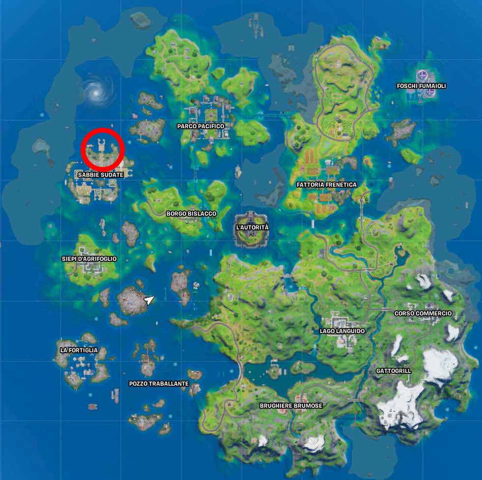 Per completare questa sfida in primis sarà necessario raggiungere la location di Sabbie Sudate, tra le coordinate B3 e B4 della mappa di gioco nella zona a nord-ovest della mappa.