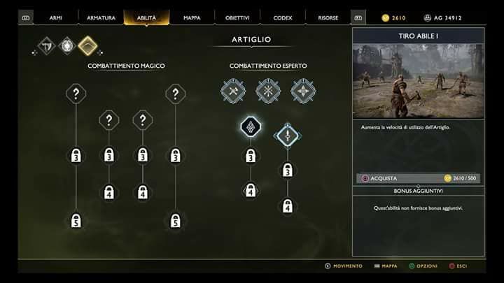 - Tiro Abile = investendo punti esperienza in questa abilità andrete ad incrementare il rateo di fuoco del nostro Atreus, facendogli così scagliare più frecce nello stesso lasso di tempo. Inutile sottolineare, quindi, quanto questa skill, insieme alla precedente, possa rivelarsi un elemento chiave in tantissimi scontri;