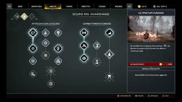 - Furia di Sparta = nonostante non sia esattamente un’abilità disponibile nello skill tree dello Scudo del Guardiano, non dimenticatevi mai di migliorare questo parametro, in quanto gli attacchi disponibili in questa modalità vi torneranno decisamente utili;
