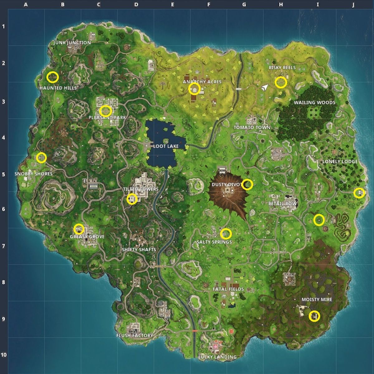 Per trovare ogni lettera in Fortnite, i giocatori devono visitare almeno otto delle località elencate qui di seguito. La sfida non prevede che si visitino le posizioni in un ordine prestabilito; troverai le lettere nell’ordine corretto a prescindere da dove le cerchi. Le lettere che formano il titolo del gioco sono otto, ma ci sono più location di quelle che poi servono effettivamente, quindi basta andare in otto di queste location e dovresti essere in grado di completare la sfida delle lettere F-O-R-T-N-I-T-E in pochissimo tempo.