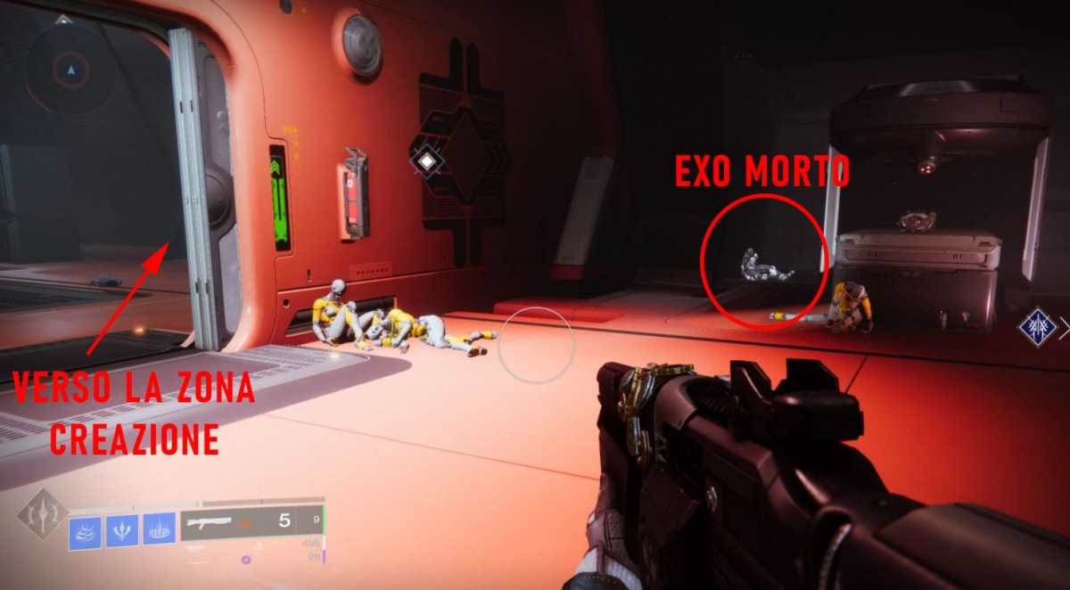 Proseguendo tenendo come riferimenti la vetrata e il teletrasporto, troverete l’Exo morto a sinistra, appoggiato contro un pannello verticale nero.