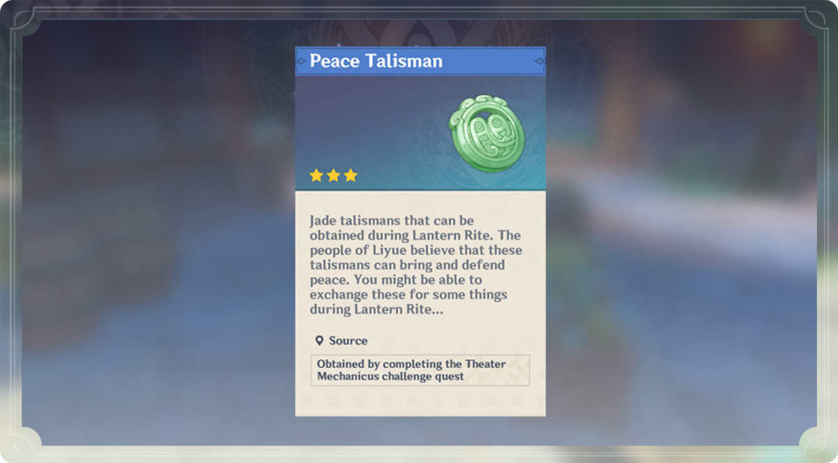 I viaggiatori possono usare i Peace Talismans nello Xiao Market per scambiarli con varie ricompense, tra cui lo stile namecard “Celebration: Lantern-Light”, materiali per il potenziamento del personaggio, Hero’s Wit, Mystic Enhancement Ore, Talent Level-Up Materials, la Crown of Insight e altro ancora.
