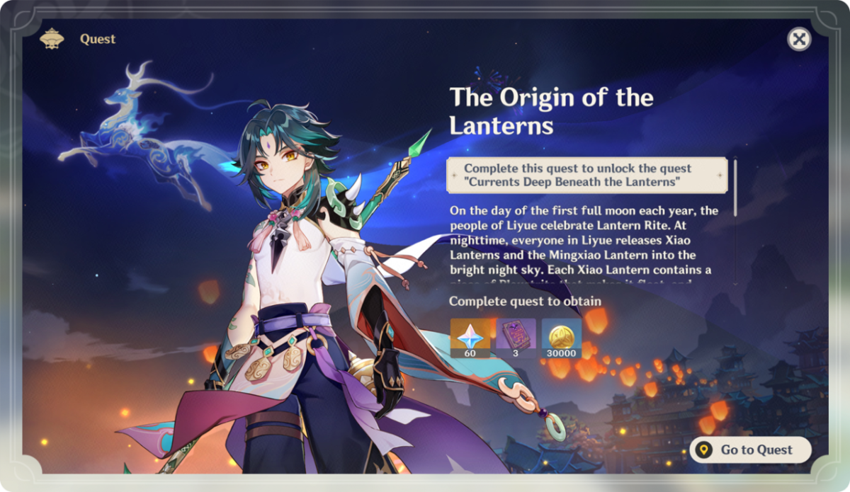 Il giorno della prima luna piena di ogni anno, la gente di Liyue celebra il Rito delle Lanterne. Di notte, tutti a Liyue liberano le Lanterne di Xiao e la Lanterna Mingxiao nel luminoso cielo notturno. Tu e Paimon arrivate a Liyue mentre la festa è in pieno svolgimento, preparatevi a divertirvi!