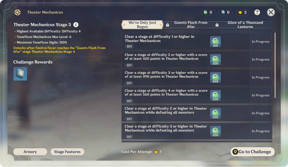 L’accumulo di Festive Fever ha tre fasi: ” We’ve Only Just Begun,” “Guests Flock From Afar,” e “Glow of a Thousand Lanterns”. I viaggiatori possono controllare il loro attuale totale cumulativo e la fase della Festive Fever alla pagina dell’evento Lantern Rite.